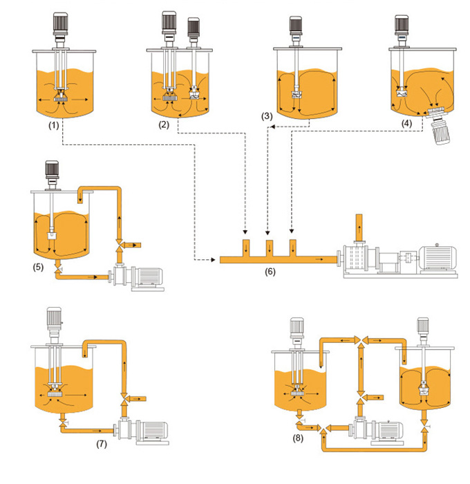 工作原理: 高剪切均質乳化機就是高效、快速、均勻地將一個相或多個相分布到另一個連續(xù)相中,而在通常情況下各個相是相互不溶的,由于轉子高速旋轉所產生的高切線速度和高頻機械效應帶來的強勁動能,使物料在定、轉子精密吻合的間隙中受到強烈的機械及液力剪切、離心擠壓、液層摩擦、撞擊撕裂和湍流等綜合作用,與此同時在轉軸上高速旋轉的分散輪的作用,又形成上、下兩股強烈的翻動湍流。從而使不相溶的固相、液相、氣相在相應成熟工藝和適量添加劑的共同作用下,瞬間均勻精細地分散、均質、乳化,罐內物料經過高頻率的上下翻滾和循環(huán)往復,最終得到穩(wěn)定且品質高的物料產品。